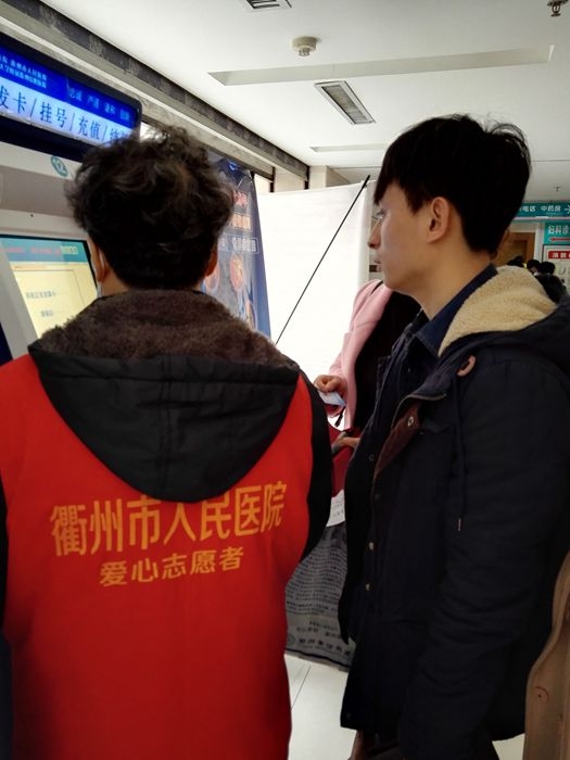 ??? 王金妹、葉時(shí)輯、方月升、汪益珠、梁敏等5人在衢州市人民醫(yī)院做志愿者,主要來自社會志愿者。 志愿者們主要為患者指路引導(dǎo),陪伴行動不便、年老體弱患者就診,指導(dǎo)患者自助服務(wù)機(jī)使用方法,引導(dǎo)患者化驗(yàn)前取號、打印化驗(yàn)單,協(xié)助門診大廳工作人員疏導(dǎo)病人。