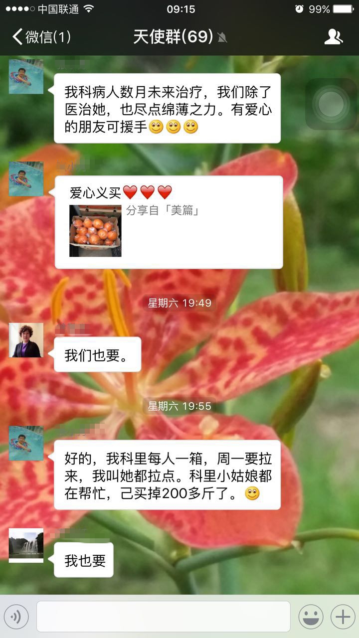??? 鄭勤紅一直關(guān)注著這個(gè)多難的家庭,得知此事后立即通過微信向院內(nèi)的醫(yī)護(hù)人員發(fā)出求助信息,消息一經(jīng)發(fā)出,院內(nèi)的醫(yī)務(wù)人員紛紛向謝冬蓮伸出援手,經(jīng)過的路人、看病的患者見此情景也紛紛鼎力相助,十箱、二十箱……熱心的企業(yè)老板得知消息后立即訂購(gòu)200箱臍橙,向謝冬蓮捐款一萬(wàn)多元,目前,我院的醫(yī)務(wù)人員已經(jīng)幫助謝冬蓮售出600多箱臍橙,為謝冬蓮籌集資金四萬(wàn)余元。