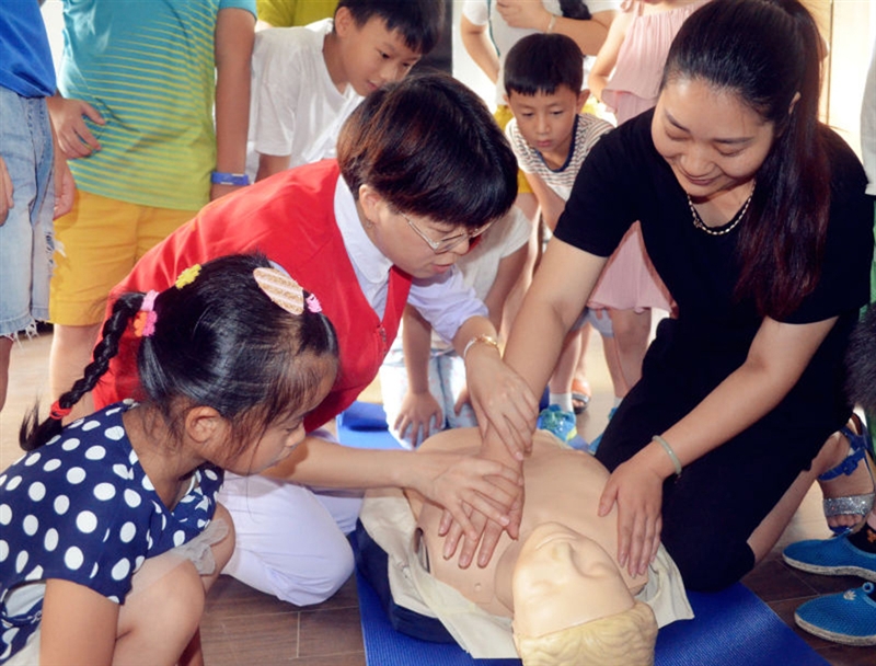 ??? 7月14日上午,浙江省紅十字會(huì)應(yīng)急救護(hù)培訓(xùn)骨干師資、我院門診部邵微穎護(hù)士長來到府山社區(qū)開展現(xiàn)場應(yīng)急救護(hù)的培訓(xùn)。邵護(hù)士長應(yīng)用豐富的理論知識和嫻熟的實(shí)踐操作技能,為在場的40多位家長和孩子講解和示范了心跳呼吸驟停時(shí)如何進(jìn)行急救和處置,如何預(yù)防踩踏事件的發(fā)生,如何逃生等自我的防護(hù)知識。在場的學(xué)生和家長認(rèn)真聆聽,積極踴躍地進(jìn)行現(xiàn)場的實(shí)踐模擬操作。