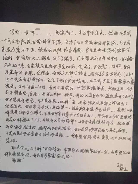 一直到現(xiàn)在,我還是不知道如何處理這樣的情況,這個孩子才15歲,非常懂事,有著和年齡不相稱的成熟和堅(jiān)強(qiáng),也許是因?yàn)槭ジ赣H的緣故。母親在診間為她的CD病情落淚,她還不忘安慰母親。我讓她寫了自己的困境,她交上來的是工工整整的冷靜的現(xiàn)狀訴說。