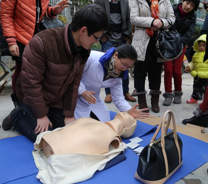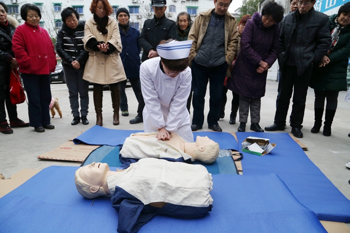 ??? 急危重病學(xué)中心護(hù)士長(zhǎng)邵微穎運(yùn)用扎實(shí)的理論知識(shí),結(jié)合精彩的PPt圖片,用通俗易懂的語(yǔ)言講授了心肺復(fù)蘇的理論知識(shí),著重介紹了如何避免擁擠處踩踏事件的發(fā)生以及發(fā)生意外事件時(shí)的自救方法。此外,還進(jìn)行了室外模擬演練和心肺復(fù)蘇演示。社區(qū)的黨員干部分2組進(jìn)行練習(xí),現(xiàn)場(chǎng)氣氛相當(dāng)活躍。