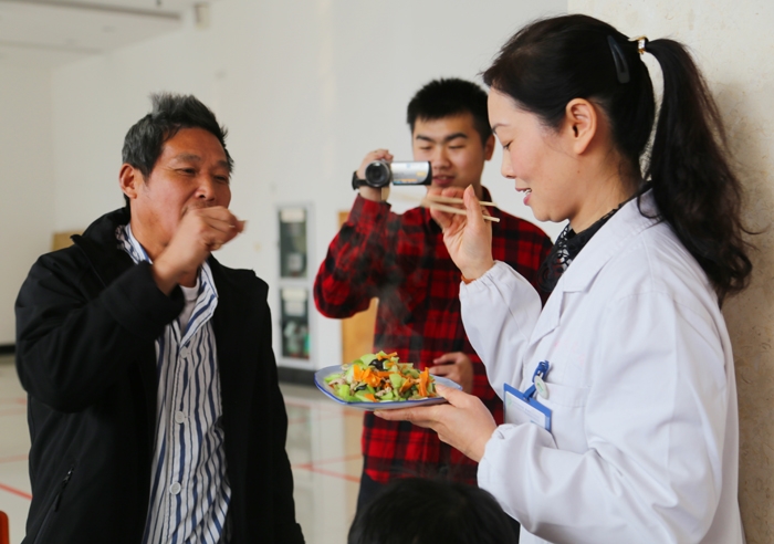 ??? 活動邀請了市疾控中心方春福主任作知識講座,講解了糖尿病的高發(fā)流行現(xiàn)狀以及積極防治的重要性。我院營養(yǎng)科主任毛春英為患者講授了正確進行食物選擇的方法,以及如何進行營養(yǎng)配餐。為了讓患者掌握營養(yǎng)餐的制作過程,營養(yǎng)科廚師現(xiàn)場進行了烹調(diào)展示,講解了炒菜時添加油、鹽和利用量和方法。隨后大家興致勃勃地品嘗了合理用料菜品的味道,提高了糖尿病患者在飲食方面的知識水平和實踐操作能力。