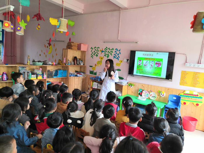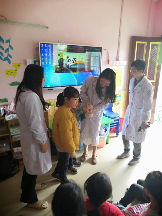 醫(yī)護(hù)人員現(xiàn)場(chǎng)用蛋殼與食醋發(fā)生反應(yīng)的實(shí)驗(yàn)生動(dòng)形象地告訴小朋友們不良飲食習(xí)慣給牙齒帶來(lái)的危害,并教會(huì)小朋友正確的刷牙方法。
