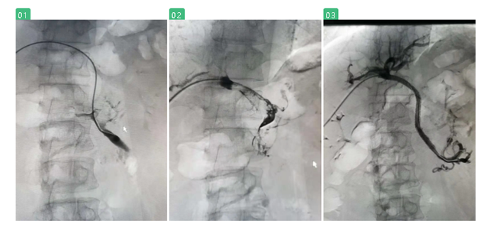 經(jīng)過季肋部穿刺至門靜脈時,發(fā)現(xiàn)江先生的門靜脈及腸系膜上靜脈已完全閉塞,程國兵巧妙地引入導絲、放入導管,一點點清除門靜脈血栓,最后,成功放入支架。