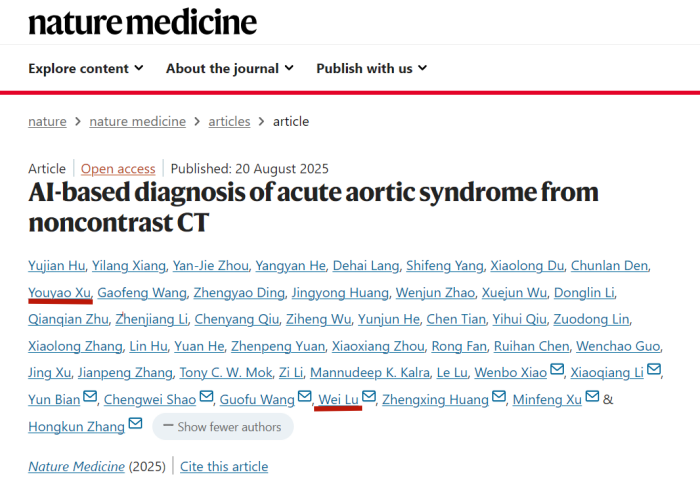 日前,全球頂尖醫(yī)學(xué)期刊《Nature Medicine》在線發(fā)表了一項(xiàng)關(guān)于急性主動脈綜合征(AAS)人工智能診斷的重要研究成果——《AI-based diagnosis of acute aortic syndrome from noncontrast CT》。我院血管外科作為核心參與單位之一,黨委委員、副院長陸煒作為共同通訊作者,為本研究提供了重要臨床數(shù)據(jù)與技術(shù)支持。